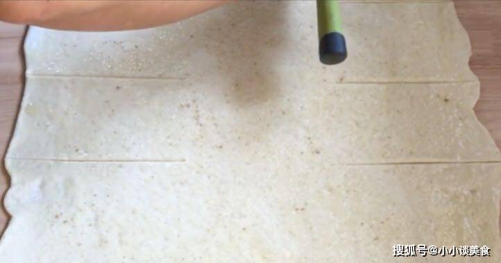 2.時間到瞭,如果發現面團有豐富的蜂窩狀,就說明發酵好瞭。案板上撒上幹面粉,取出面團,用空氣揉至光滑,然後搟成一個約2毫米厚的大餅。在搟好的皮上鋪一層,撒上鹽和胡椒粉,把皮對稱切開,翻過來,用力壓住皮的邊緣,然後用搟面杖輕輕搟薄,兩面搟薄。