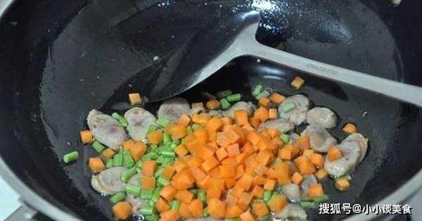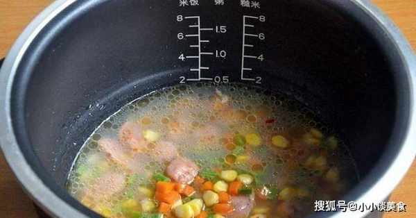 然後我們把切好的胡蘿卜、玉米和豇豆分別放入電飯鍋中炸至兩面金黃。此時,將預先切好的香腸片放入電飯鍋中,邊攪拌邊炒至順滑。然後加入適量料酒拌勻。最後將洗凈的米倒入電飯鍋中翻炒,加入生抽和食鹽。然後倒入適量的開水,開水要沒過食材。讓它慢燉25分鐘,即可食用。