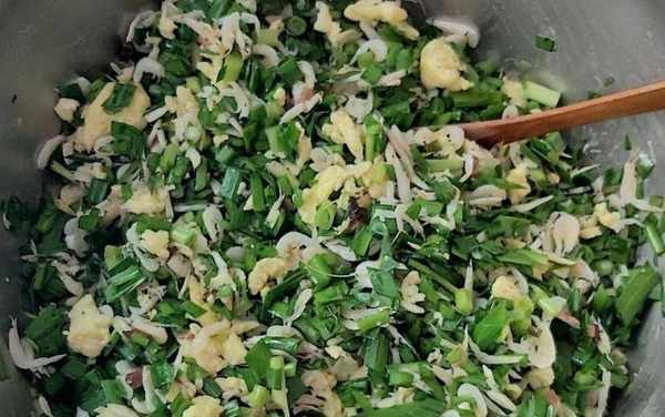 第三步:等雞蛋裂開冷卻後,放入盆中,繼續加入韭菜和蝦皮,撒上所需量的椒鹽粉拌勻成餡。