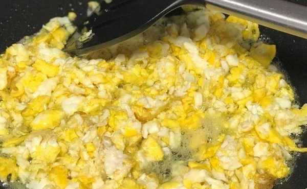 第二步:鍋裡放油燒熱,油燒開後倒入蛋液,待蛋液成型熟瞭,磨碎備用。