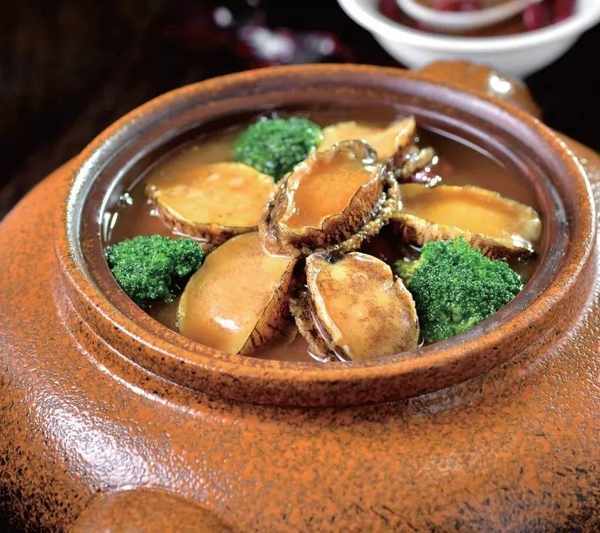 4.把蒸熟的紅腰豆和玉米粒裝進砂鍋內墊底,再放入鮑魚,然後將壓鮑魚的原湯勾米湯芡,淋在鮑魚上面,最後擺上焯熟的西藍花即成。