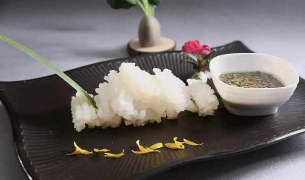 此菜是把鮮魷配蘸水蘸食,口感脆爽。
