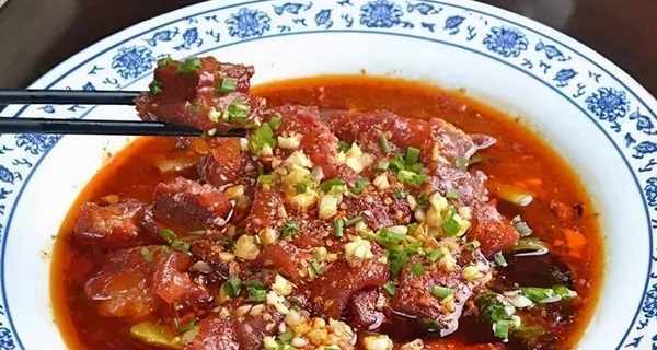 此菜是把江南地區的東坡肉和四川常見的水煮技法相嫁接,而讓成菜後的東坡肉糯而不膩,麻辣鮮香。