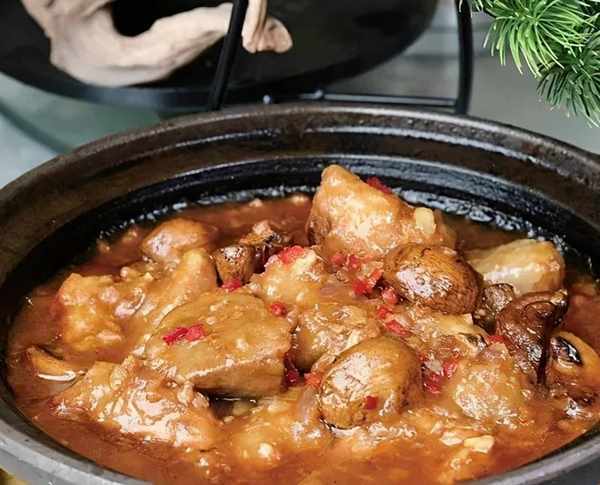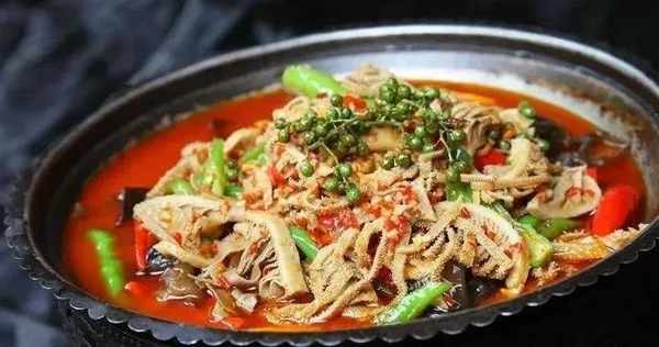3.鍋裡放化豬油燒熱,先投入青紅尖椒節、鮮青花椒和小米辣碎,炒香才摻椒湯,燒開後放入千層肚稍煮,其間加鮮露、雞精和味精,最後淋入藤椒油,起鍋盛鍋仔內,即成。