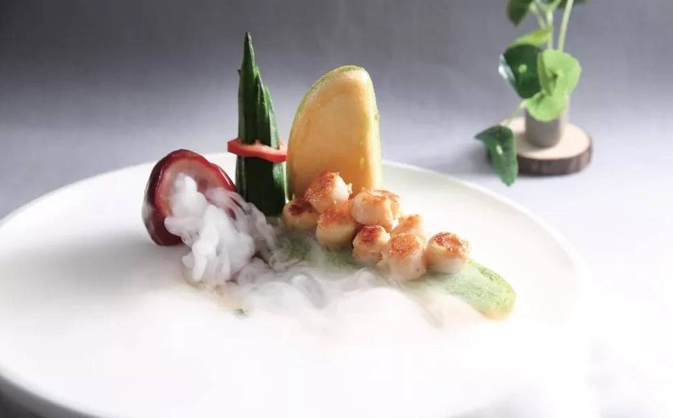 此菜是采用西式的烹飪手法,將面包、帶子與百香果相結合,造型美觀,果香味濃鬱。