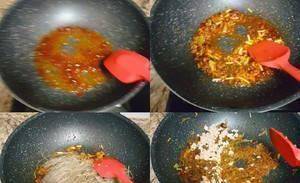 鍋內放油,紅油加醬油,放入蔥、薑、蒜拌勻,放入粉絲,炒勻。