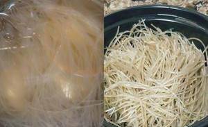 粉絲用冷水泡軟,取出刀,改成合適的長度,這樣吃的時候就不難捏瞭,尤其是人多的時候,很尷尬。