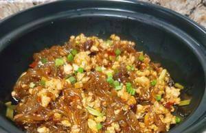 前豬肉洗凈,肉剁成肉末,放胡椒粉、熱酒和淀粉,醃十分鐘左右,熱鍋放少許油,滑入肉末,炒至變白備用。