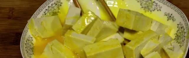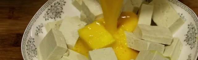 4、將蛋液倒入豆腐中,輕輕攪拌,使每塊豆腐均勻地沾上一層蛋液,備用。