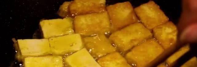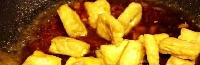 8.在平底鍋中加熱油。油熱後,將豆腐倒入鍋中,用小火慢慢煮至豆腐的一側凝固,顏色呈金黃色。把豆腐全部翻過來,繼續文火慢炒。當所有豆腐表面金黃熟透,皮微焦時,即可出鍋。