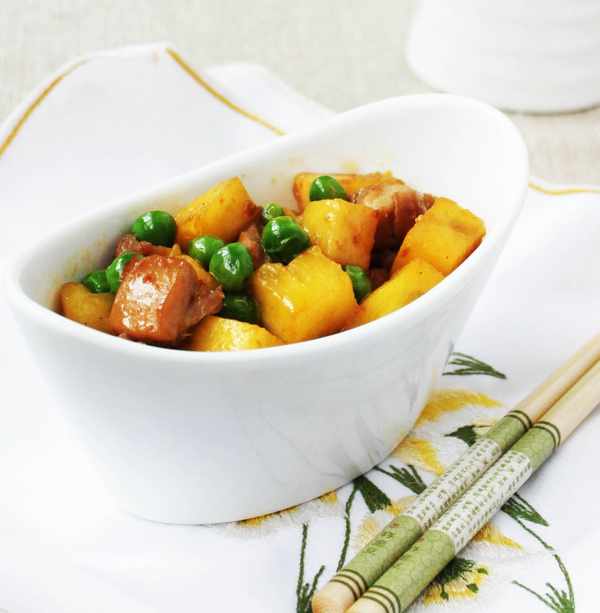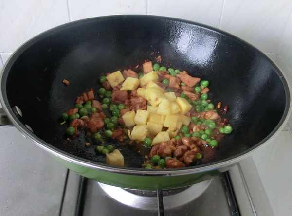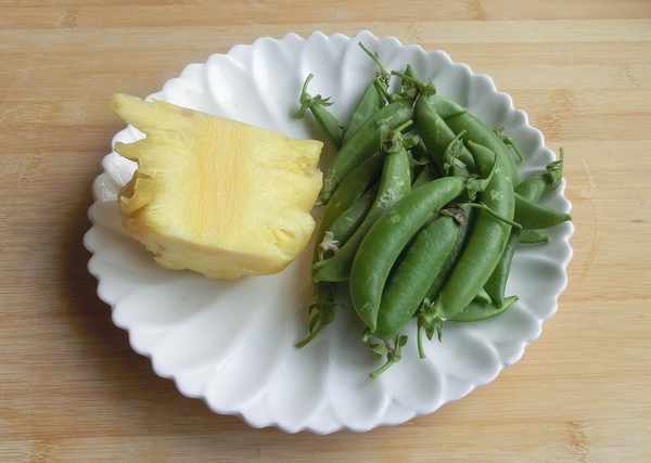 材料:雞腿肉300克、菠蘿200克、鮮豌豆300克。