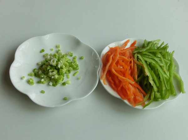 2. 紅椒、青椒洗凈,切絲;香蔥切末。