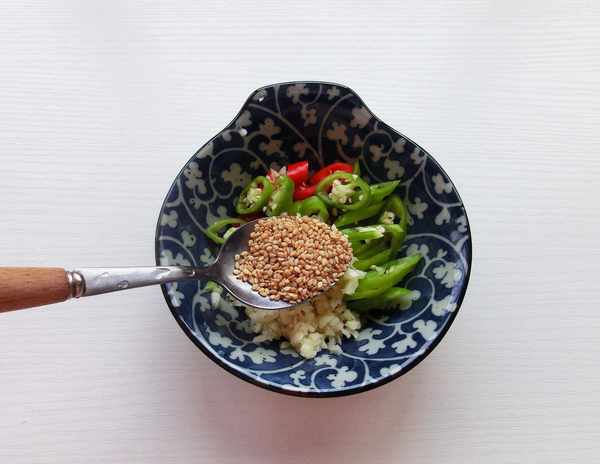 調料:蒜末20克,小米椒2個,線椒2個,芝麻10克,糖3克,生抽20克,醋15克,蠔油10克,青花椒3克,花椒3克。
