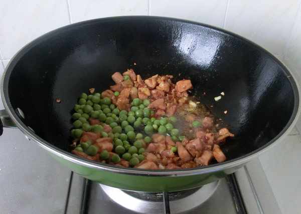 4、倒入豌豆粒翻炒,放入鹽、白糖、生抽調味