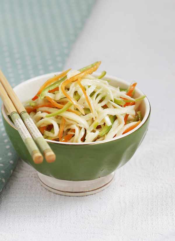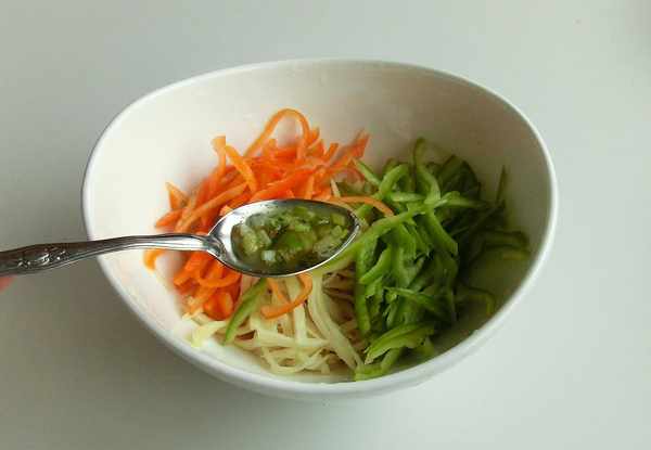 5.茭白、紅椒、青椒放入大碗中,將蔥油放入碗中,調入鹽、雞精拌勻即可。