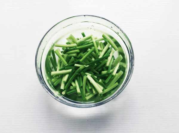 5.將焯好水的蒜苔迅速放在冷水中投涼,撈出瀝凈水分待用,蒜苔焯水後,要放在冷水中投涼,這樣蒜苔顏色就不會變黃,還能保持蒜苔脆嫩的口感。如果蒜苔焯水後不過涼水,蒜苔還有溫度,一會顏色就會變黃。