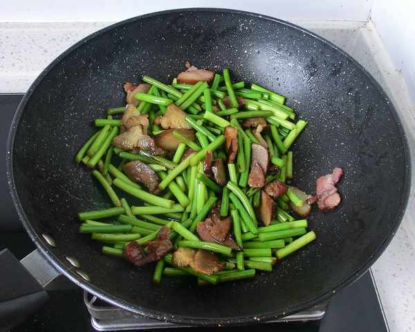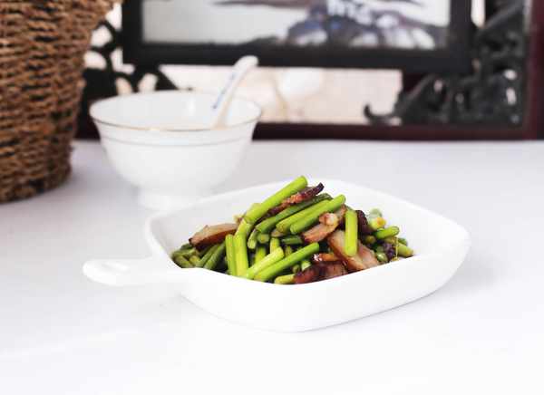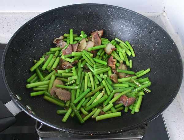 2. 臘肉切成片,炒出的蒜苔味道香,如果用瘦肉或者裡脊肉,切絲後加淀粉醃制一下,炒出的肉絲口感嫩。