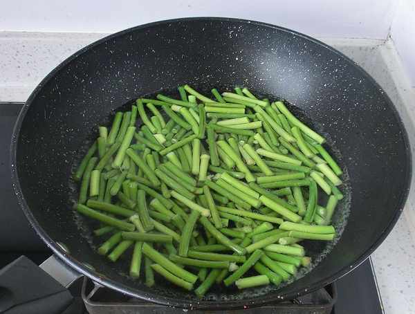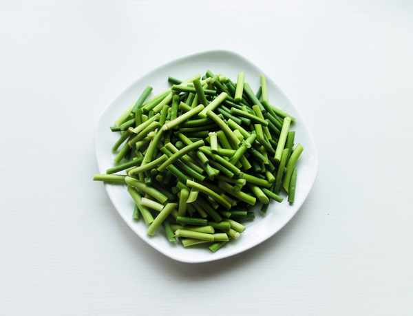 做法:1.蒜苔用手掐去頭部和尾部較老的部位,洗凈,瀝凈水分。蒜苔切成寸段。