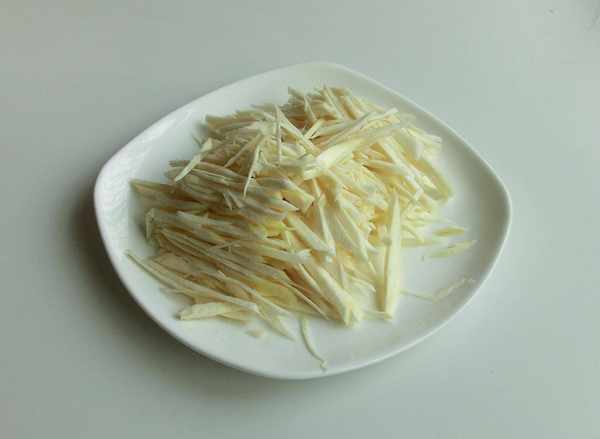 3. 茭白放入鍋中,焯水撈出,瀝幹水分。