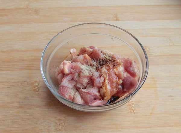 做法:1、雞腿肉切丁,用鹽、料酒醃制20分鐘