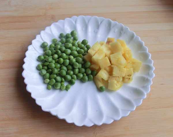 2、菠蘿切丁,鮮豌豆去皮,剝出豌豆粒,焯水過涼待用