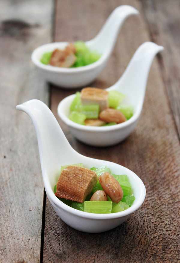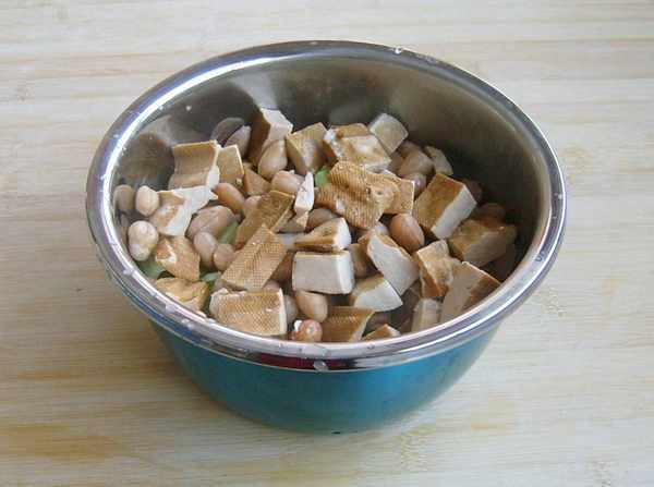 5、花生米、西芹、豆幹焯水後倒入盆中,放入鹽、花椒油、雞精、香油拌勻即可