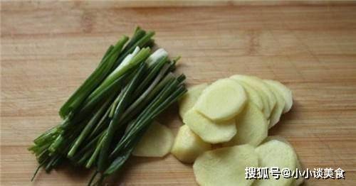 *2步:讓它浸泡約一個小時,確保換水一次,然後再次清洗。然後先準備好材料,把蔥和薑洗幹凈做底,洗凈一把蔥,然後切成長條,繼續切一些薑。