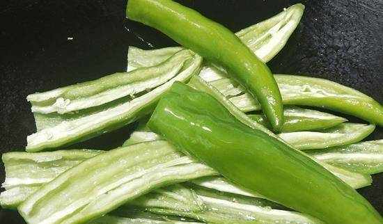 第四步:最後一步,開小火,倒入少許蠔油,拌勻,再倒入青椒拌勻。能吃辣的就加點紅油。