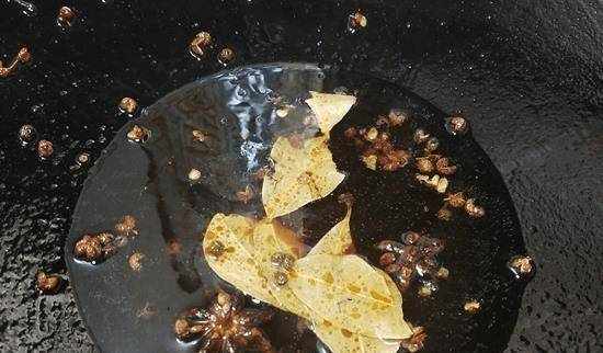 第三步:鍋內還有少許底油,轉小火,加入月桂葉、八角、生抽、糖、白醋、蠔油,不要放蒜瓣,最後放步驟,鍋中加入花椒。現在攪拌香料,大約一分鐘。