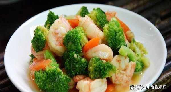 材料:西蘭花、胡蘿卜、鮮蝦、蒜頭、生抽、料酒、蠔油、糖、香料。