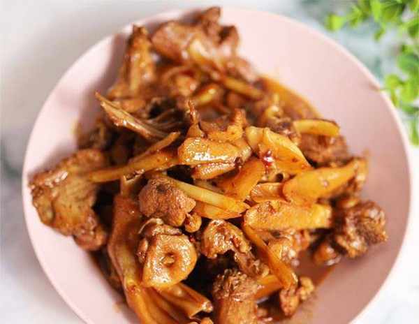 1.熱鍋放油,放入嫩鴨,炒至出油後,加入嫩薑繼續翻炒幾分鐘。