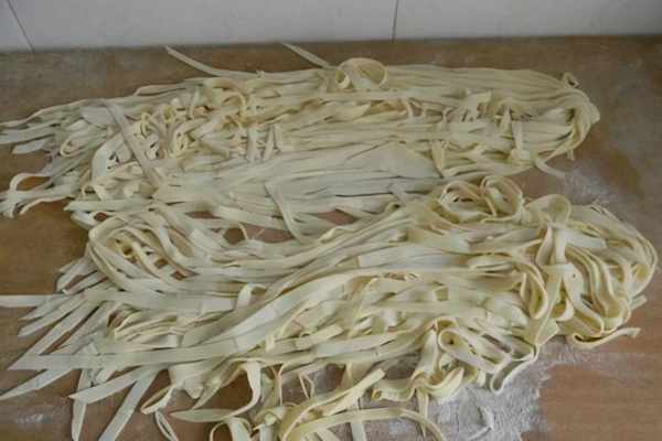 最難的是切面條,這更是技術活。母親切得面條細而勻稱,刀在她手裡輕松自如,一氣呵成。而我剛開始切面條,刀在手裡仿佛千斤重,提不起來。左右壓在面條上,一點點右後退。右手緊跟著前進,一刀刀切下去。可是我的左右手配合不協調,隻能一下一下地切,切出的面條寬一條、窄一條,粗細不等。