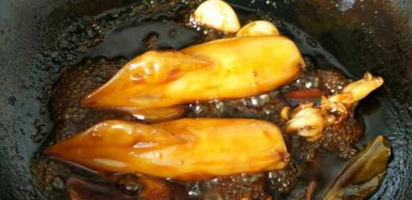 第三步適當瀝幹水分,加入料酒、老抽、生抽、糖和鹽,蓋上鍋蓋煮至收汁,關火,起鍋。將魷魚切成段,然後將湯倒入鍋中,撒上一些蔥花。