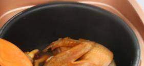 第四步:經典鍋裡倒入少許花生油,放入鴨肉,再放入薑末、蒜末、小蔥末、冰糖,倒入半碗藥明,醬油適量,蓋上蓋子,按烹飪按鈕並等待45分鐘。
