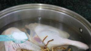 第三步:鍋內加入冷水燒開,加入鴨肉、陳皮和鹽,開蓋繼續煮15分鐘,撈出鴨肉。