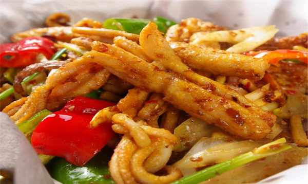 材料:魷魚(幹)70克,筍75克,洋蔥(白皮)40克,海綿(幹)40克,生薑2克,植物油40克,大蒜(白皮)10克皮)、黃酒1克、淀粉(豌豆)5克、花椒0克、堿1克。