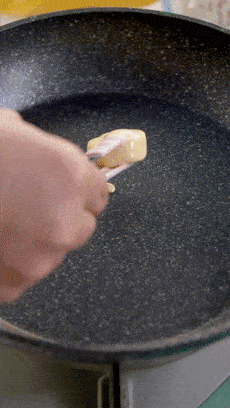 裹好的香蕉片放進鍋裡,全程開小火烙,溫度一定要控制好。