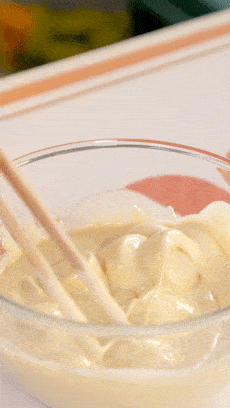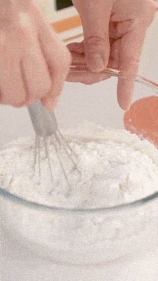 因為香蕉容易氧化,我們先來做外面的那層面糊。碗裡打入雞蛋,和牛奶、面粉一塊攪到完全沒有顆粒的狀態,就可以瞭。