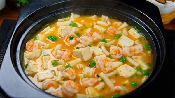 2、重新起鍋燒油,切幾個咸蛋黃,或者直接來一勺咸蛋黃醬,小火慢慢炒香,炒出大量起泡,然後倒入用蝦頭煮出來的高湯。煮開後加鹽和糖調味,再依次倒入白玉菇和豆腐,中火煮兩分鐘煮入味後倒入蝦仁,來一點青豌豆配一下色,在大火收之後就可以吃瞭。