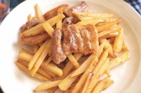 五花肉和土豆酥脆,包裹在蛋黃醬和番茄醬中,鮮味和酸度完美結合。生炸土豆絲的酥脆質地類似於炸薯條,讓人上癮。這是一道孩子們會喜歡的豐盛菜肴。用蛋黃醬和番茄醬混合的醬汁煎五花肉和土豆。大人小孩都喜歡的口味!