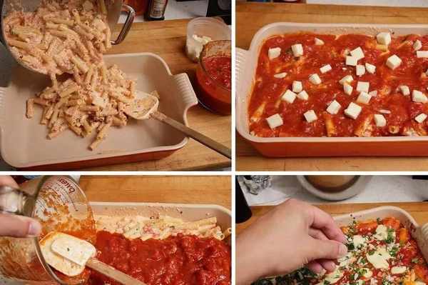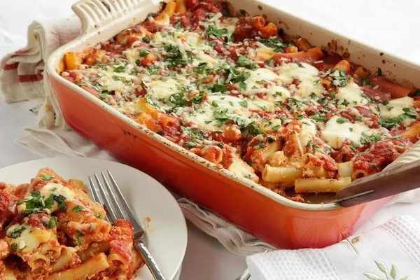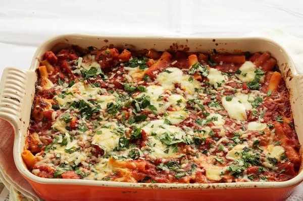 浸泡意大利面而不是煮沸它可以提供完美的烤意大利面,而無需使用額外的鍋或等待它煮沸。基本的馬力拉醬與重奶油和乳清幹酪的混合物使意大利面保持濕潤和美味。馬蘇裡拉奶酪丁塊形成獨特的融化奶酪口袋,以增加質地對比。烤紫薯是我在一年一度的滑雪勝地做的菜,我?和我的朋友每年都會在新英格蘭吃。很少有面食烘焙更容易放在一起卻能產生如此可笑的好結果,尤其是當外面下雪並且你有一大群朋友要喂食時。面條拌上粉紅色的番茄醬、奶油和意大利乳清幹酪的混合物,再加上幾個雞蛋,讓砂鍋在烹飪時有結構。我還喜歡將馬蘇裡拉奶酪塊和意大利面一起攪拌,形成粘稠的、有彈性的口袋。我在整件事上加瞭一些馬力拉、更多的馬蘇裡拉奶酪和一塊帕爾馬幹酪。