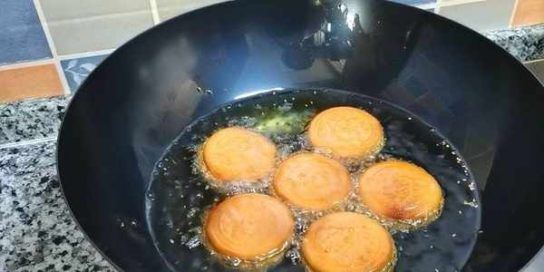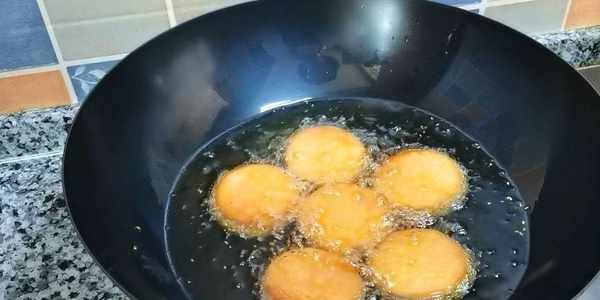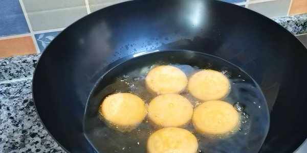 9,油燒至五成熱,調小火,下小餅,小火慢炸。