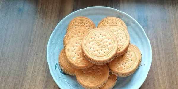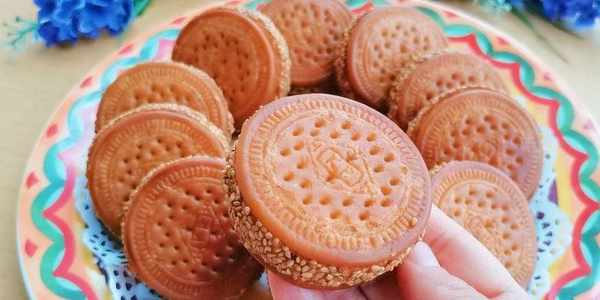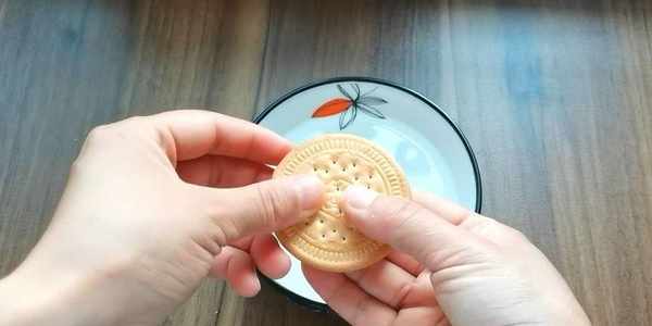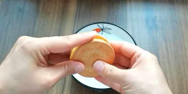 6,在小餅的另一面也抹上一層清水,放上餅幹捏緊。