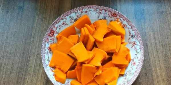 1,南瓜去皮切片,上鍋蒸熟。