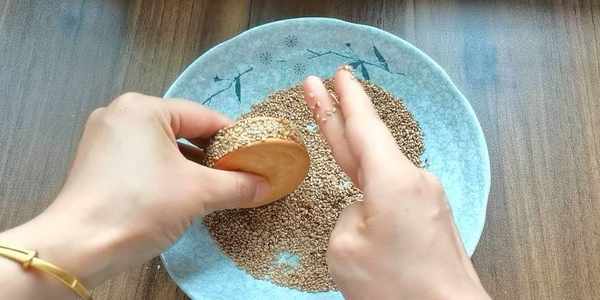 8,給邊緣也抹上一層清水,裹上一層芝麻,稍微把芝麻壓實,防止炸的時候芝麻脫落,