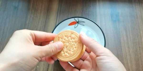 5,在餅的一面抹上一層清水,放上一塊餅幹,稍微輕輕捏緊。