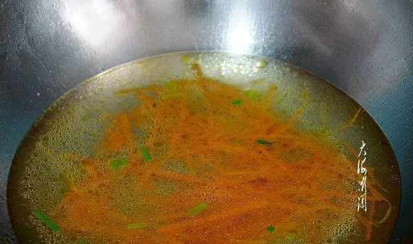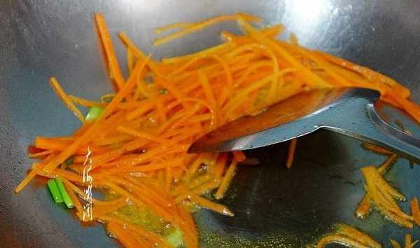 炒鍋加入適量的油,爆香蔥花五香粉,下入胡蘿卜絲翻炒均勻。