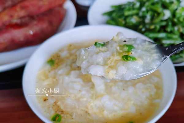 那時傢裡是柴火大鐵鍋,米飯是煮水撈飯。先燒一大鐵鍋的開水,再下入淘洗好的大米,煮至大米斷生沒有夾心的飯粒,撈出瀝幹水放入大木蒸桶裡,留著中飯和晚飯吃。鍋內的米湯裡留少量飯粒繼續熬煮至黏稠,便是早餐的米粥。蛋花粥就是將蛋液淋在米湯粥裡攪勻,加鹽和蔥花攪勻就可。