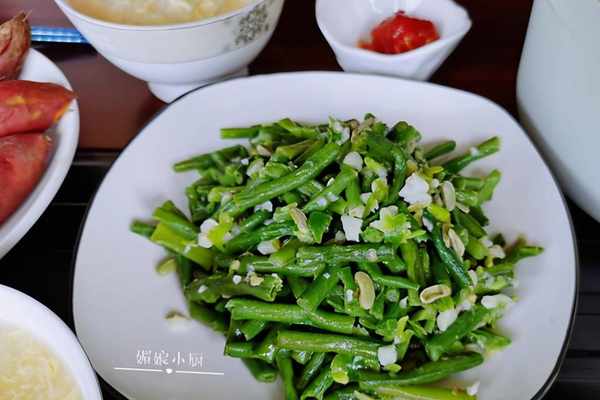 步驟:①,缸豆洗凈瀝幹水,摘掉兩頭,撅成寸段,蒜切末,尖椒切碎