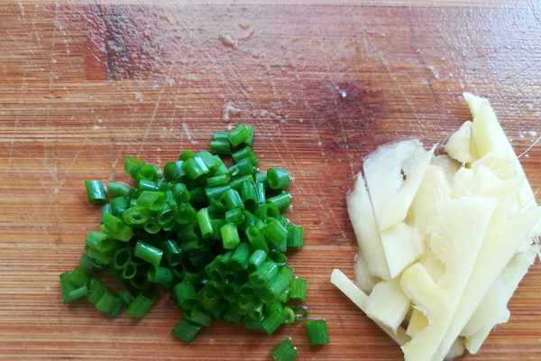 3.生薑去皮切薄片,蔥花隻要葉子部分切成小段。